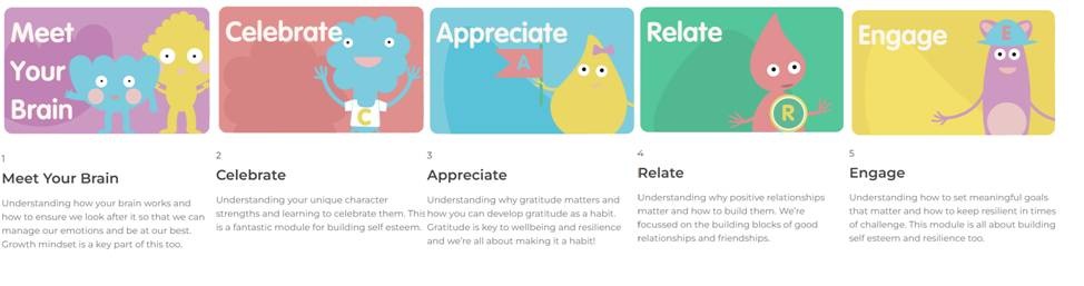 myHappymind is taught across five modules and each introduces a new set of content and habits to help children build resilience, self-esteem and confidence: